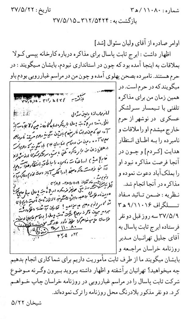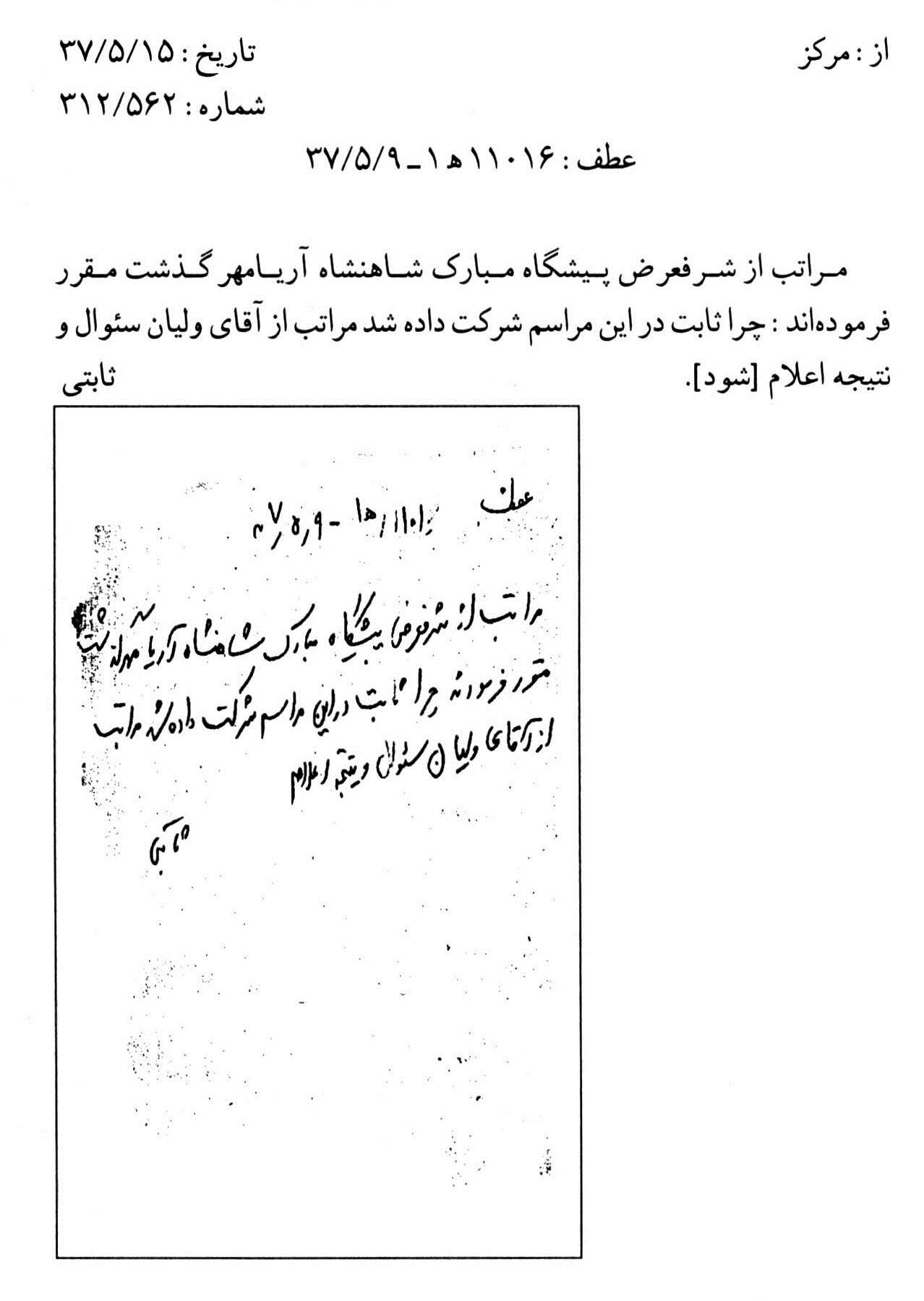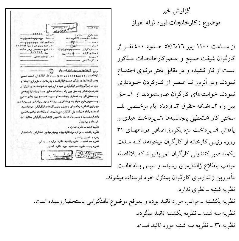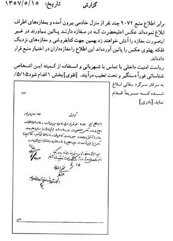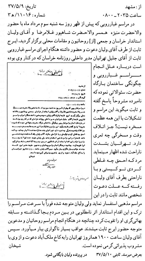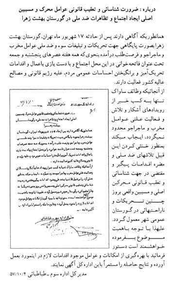 سند دیگر امروز اجتماع مردم در بهشت زهرا(س) مربوط به سال 1357 را نشان میدهد. لازم به یادآوری است که پس از کشتار مردم در 17 شهریور 1357، انقلابیون و خانوادههای شهدا روزهای پنجشنبه و جمعه را در بهشتزهرا(س) اجتماع کرده و به این ترتیب علیه رژیم پهلوی مبارزه میکردند. در بخشی از این سند آمده است: «همه هفته عصرهای پنج شنبه و جمعه تحت عنوان فاتحهخوانی در این محل اجتماع و با دست یازی به اعمال و اقدامات تحریکآمیز و برانگیختن احساسات عمومی مردم، علیه رژیم قانونی و مصالح عالیه کشور فعالیت دارند.»