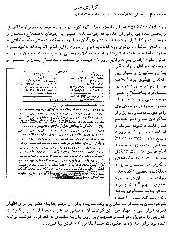 سند زیر به پخش اعلامیه در مدرسهی حجتیه قم در سال 1356 اشاره میکند. محور این اعلامیهها مبارزه با رژیم پهلوی و حمایت از امام خمینی (ره) بوده است.