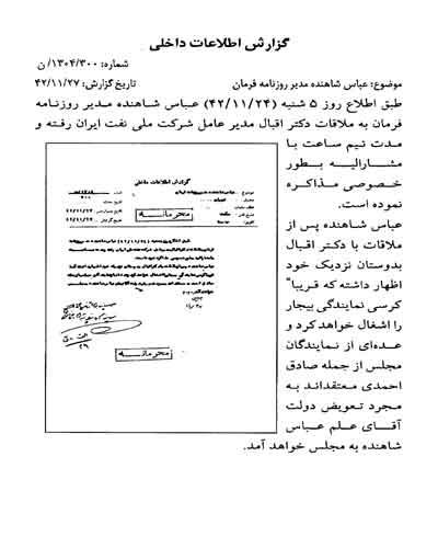 نزدیکی به رجال با نفوذ، یکی از راههای ورود به مجالس عصر پهلوی بود. در سند زیر میبینیم که عباس شاهنده، از چهرههای مطبوعاتی عصر پهلوی، از طریق ارتباط با منوچهر اقبال، مدیر عامل شرکت ملی نفت ایران در سال 1342 به دنبال ورود به مجلس شورای ملی بوده است. در بخشی از سند میخوانیم: «عباس شاهنده پس از ملاقات با دکتر اقبال به دوستان نزدیک خود اظهار داشته: که قریباً کرسی نمایندگی بیجار را اشغال خواهد کرد و عدهای از نمایندگان مجلس از جمله صادق احمدی معتقدند به مجرد تعویض دولت آقای علم، عباس شاهنده به مجلس خواهد آمد.»