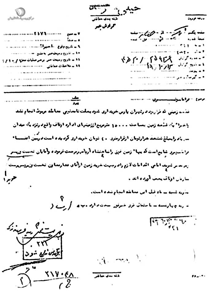 قطعه زمینى که قرار بود در تهرانپارس خریدارى شود به علت نامعلومى معامله مربوط انجام نشد و اخیراً یک قطعه زمین به مساحت 15000 متر مربع از زمینهاى اداره اوقاف واقع درنزدیک میدان شهیاد را به مبلغ ششصد هزار تومان از قرار مترى 40 تومان خریدارى گردیده است. در بین اعضاى فراماسونرى شایع است که بهاى زمین فوق را شاهنشاه آریامهر مرحمت فرموده و آقایان نخستوزیر و مهندس شریفامامى اقدامات لازم را در جهت خرید زمین از آقاى عصار معاون نخستوزیر و سرپرست سازمان اوقاف به عمل آوردهاند.