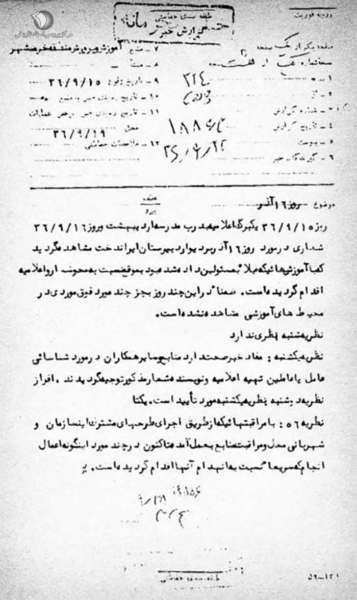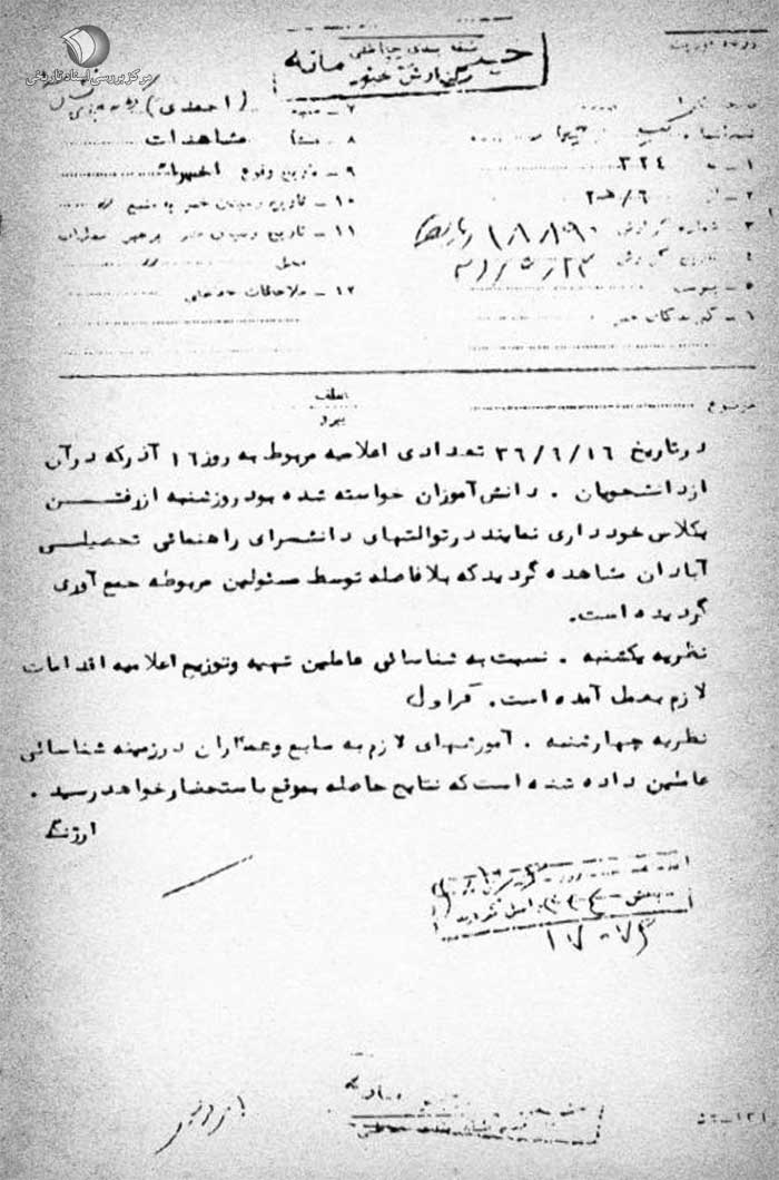 روز 15 / 9 / 36 یک برگ اعلامیه به درب مدرسه اردیبهشت و روز 16 / 9 / 36 شعاری در مورد روز 16 آذر بر دیوار دبیرستان ایراندخت مشاهده گردید که با آموزشهایی که قبلاً به مسئولین داده شده بود به موقع نسبت به محو شعار و اعلامیه اقدام گردیده است.