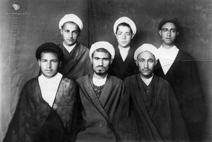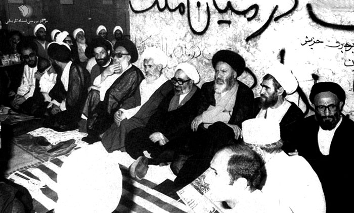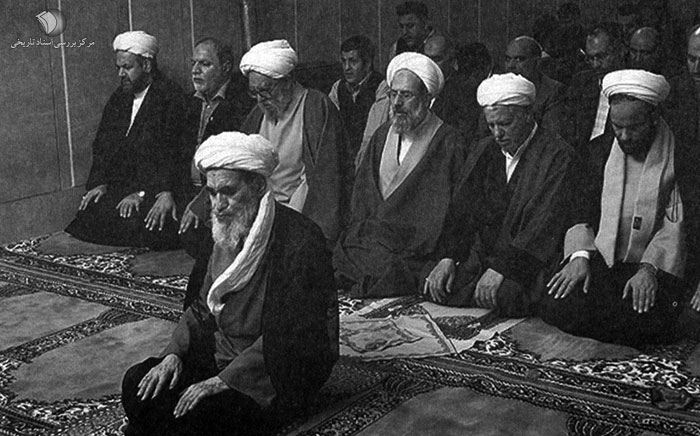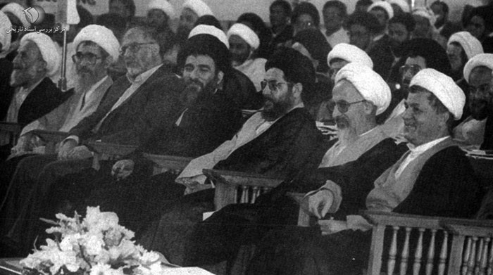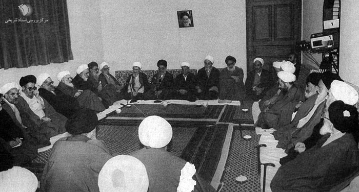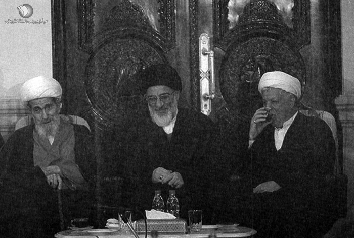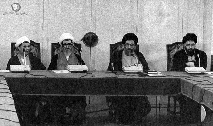 آیتالله علی مشکینی نفر وسط نشسته و در سمت راست ایشان آیتالله سید عبدالکریم موسوی اردبیلی و پشت سر ایشان آیتالله علی احمدی میانجی