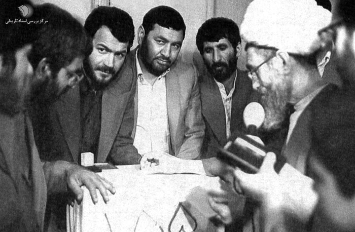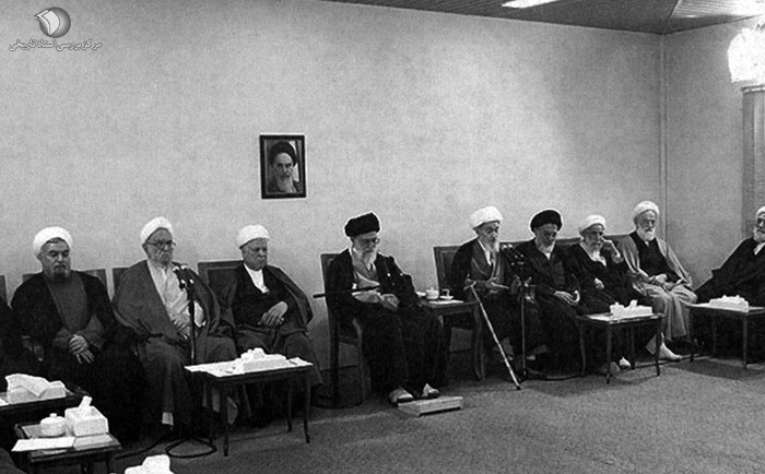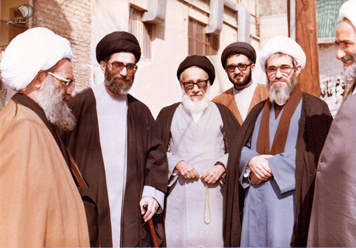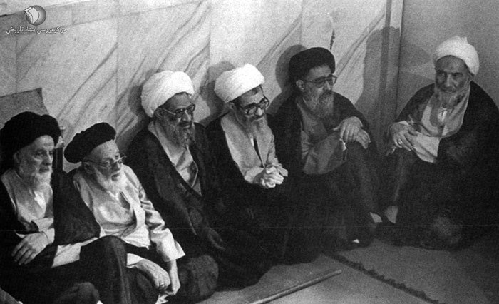 از چپ به راست: آیتالله مسلم ملکوتی، رهبر معظم انقلاب اسلامی، آیتالله روحالله خاتمی، حجت الاسلام سید علی قاضی عسکر، آیتالله علی مشکینی، آیتالله محمدرضا توسلی