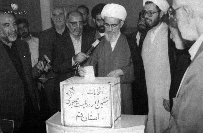 آیتالله مشکینی در حال رأی دادن به ریاست جمهوری دوره هفتم