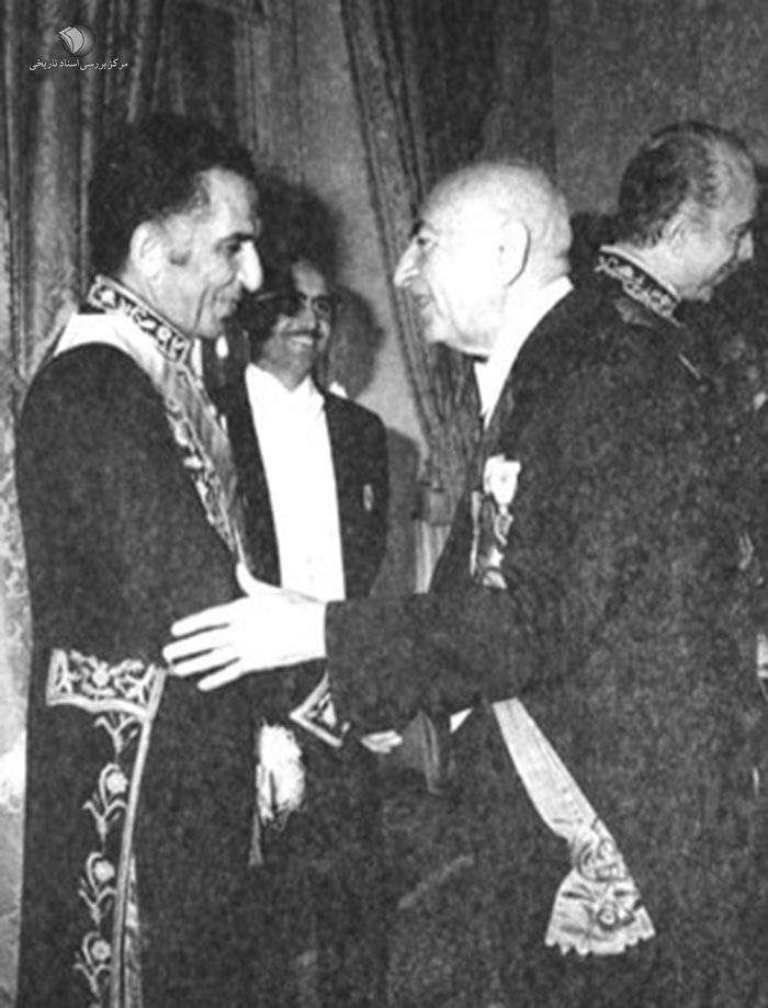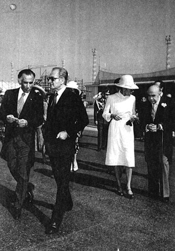 جمشید آموزگار در کنار شاه، فرح و امیرعباس هویدا