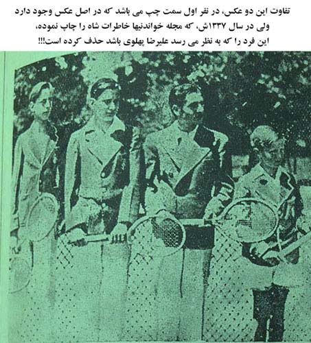 · سینیی 24 /4 /1312 « ... ساعات روز، با به تحصیل و بعضی تفریحات، از قبیل: قایق رانی و طنیس و بازی کلوله صرف می فرمایند. اسب سواری معمول مدرسه را، چون احتمال بعضی مخاطرات دارد، اقدام نفرموده و نخواهند فرمود. وقتی که شاگردان به کنار دریاچه برای شناوری و آب تنی می روند بندگان... در مدرسه با... شاهپور و حسین فردوست باقی مانده و طنیس بازی می نمایند. قایق سواری هم حسب الامر شاهانه... در تحت مراقبت و مواظبت معلم مخصوص... مجری می شود...»