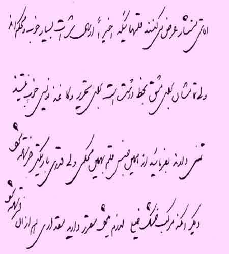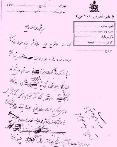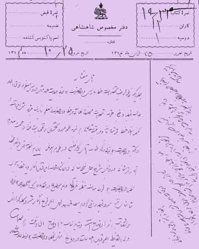 « آقای مستشار عرض می کنند قلم هائی که اخیراً ارسال شده است بسیار خوب و محکم اند، ولی تمامشان برای مشق به خط درشت است، برای تحریر و کاغذ نویسی خوب نیستند. تمنا دارند بفرمائید از همین جنس قلم، به همین محکمی، قدری باریکتر فرستاده شود. دیگر اینکه مرکب خشک خیلی لازم می شود مقرر دارید مقداری هم از آن فرستاده شود.»