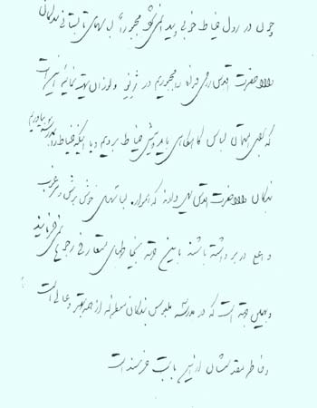 رول . 6 خرداد 1312 . « بر قدّ بندگان معظم له روحی فداه، از شش ماه پیش به این طرف، پنج سانطی مطرونیم اضافه گردیده و بر محیط سینه و پهنای پشت و شانها{شانه ها}،پنج سانطی مطر افزوده شده، بدین واسطه، لباس هائی که پیش از رفتن به گشتاد تهیه شده بود، تماماً تنگ و کوتاه گردیده و برای رفتن به ییلاق مشغول حاضر کردن لباس های تازه می باشند... غلام جان نثار علی اصغر.»