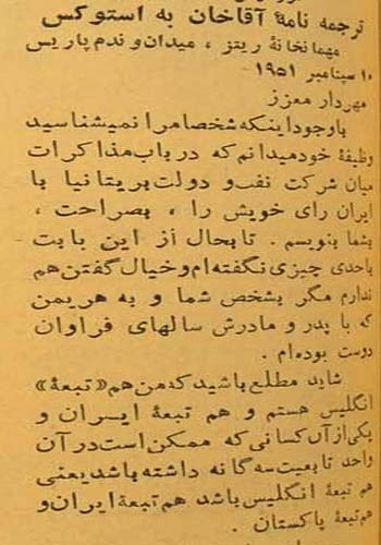 « مهردار معزز . با وجود اینکه شخصاً مرا نمی شناسید، وظیف? خود می دانم در باب مذاکرات میان شرکت نفت و دولت بریتانیا... به شما بنویسم. تا به حال از این بابت، به احدی چیزی نگفته ام و خیال گفتن هم ندارم؛ مگر به شخصِ شما و به هریمن،{اورل هریمن، نماینده مخصوص رئیس جمهور امریکا در سال 1330ش} که با پدر و مادرش سال های فراوان دوست بوده ام. شاید مطلع باشید که من هم تبع? انگلیس هستم و هم تبع? ایران و... هم تبع? پاکستان...»