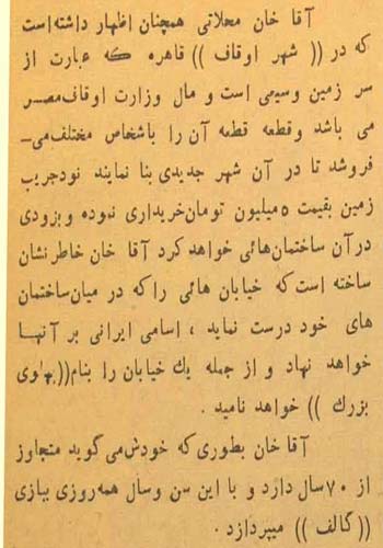 « در شهر « اوقاف » قاهره، که عبارت از سرزمین وسیعی است و مالِ وزارت اوقاف مصر می باشد و قطعه قطعه آن را به اشخاص مختلف می فروشند تا در آن شهر جدیدی بنا نمایند، نود جریب زمین به قیمت 5 میلیون تومان خریداری نموده و به زودی در آن ساختمان هائی خواهد کرد. آقاخان خاطرنشان ساخته که خیابان هائی را که در میان ساختمان های خود درست نماید، اسامی ایرانی بر آنها خواهد نهاد و از جمله یک خیابان را به نام پهلوی بزرگ خواهد نامید. آقاخان متجاوز از 70 سال دارد و با این سن و سال همه روز به بازی گلف می پردازد.»