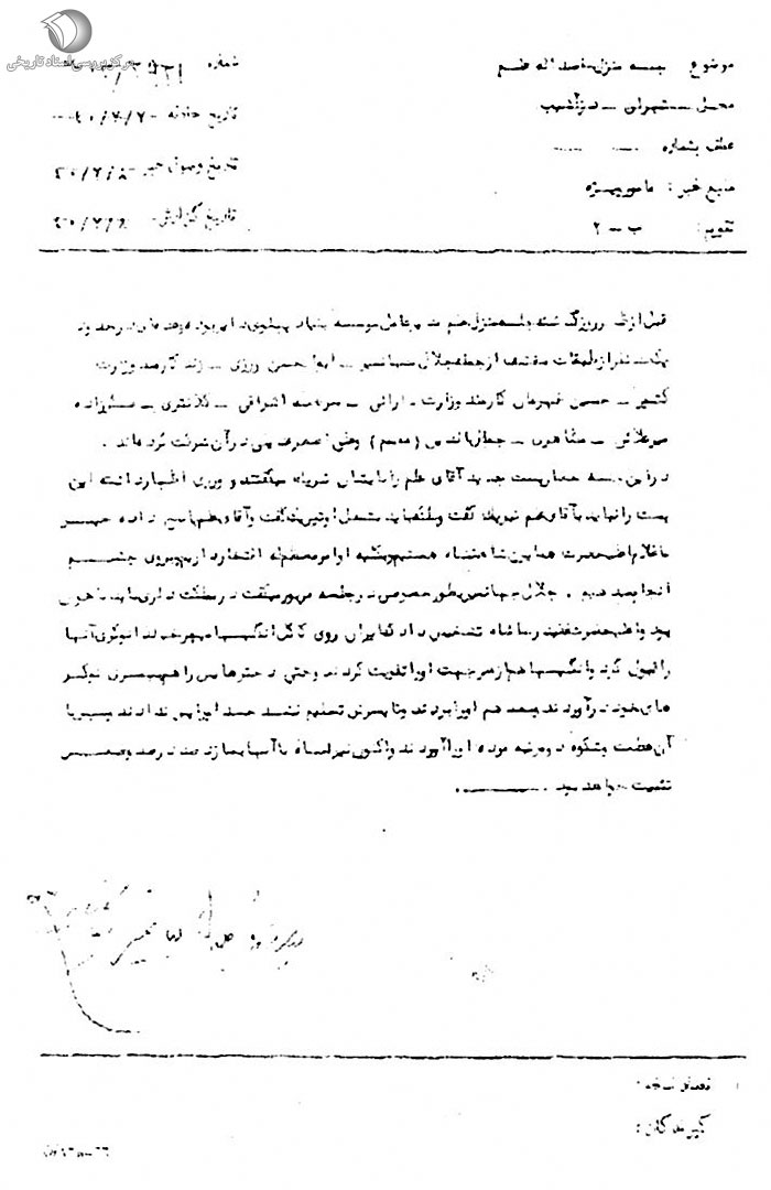 قبل از ظهر روز گذشته جلسه منزل علم مدیر عامل مؤسسه بنیاد پهلوى دایر بوده و عدهاى در حدود یکصد نفر از طبقات مختلف از جمله جلال جهانمیر، ابوالحسن ورزى، زند کارمند وزارت کشور، حسین قهرمان کارمند وزارت دارایى، سرهنگ اشراقى، کلانترى، عسگرزاده، میرعلایى، مظاهرى، جمالالدین (معمم) و علیاصغر عدیلى در آن شرکت کردهاند. در این جلسه حضار پست جدید آقاى علم را به ایشان تبریک میگفتند و ورزی اظهار داشته این پست را نباید به آقاى علم تبریک گفت و بلکه باید به شغل او تبریک گفت و آقاى علم پاسخ داده: خیر ما غلام اعلیحضرت همایون شاهنشاه هستیم و به کلیه اوامر معظم له افتخار داریم و به روى چشم انجام میدهیم. جلال جهانمیر به طور خصوصى در جلسه مزبور میگفت در مملکتدارى باید باهوش بود و اعلیحضرت فقید رضاشاه تشخیص داد که ایران روى کاکل انگلیسها میچرخد لذا نوکرى آنها را قبول کرد و انگلیسها هم از هر جهت او را تقویت کردند و حتی دخترهایش را به همسرى نوکرهاى خود در آوردند و بعد هم او را بردند و تا پسرش تسلیم نشد، جسد او را پس ندادند و سپس با آن عظمت و شکوه دو مرتبه مرده او را آوردند و اکنون نیز [اگر] شاه با آنها بسازد صد در صد وضعش تثبیت خواهدبود.