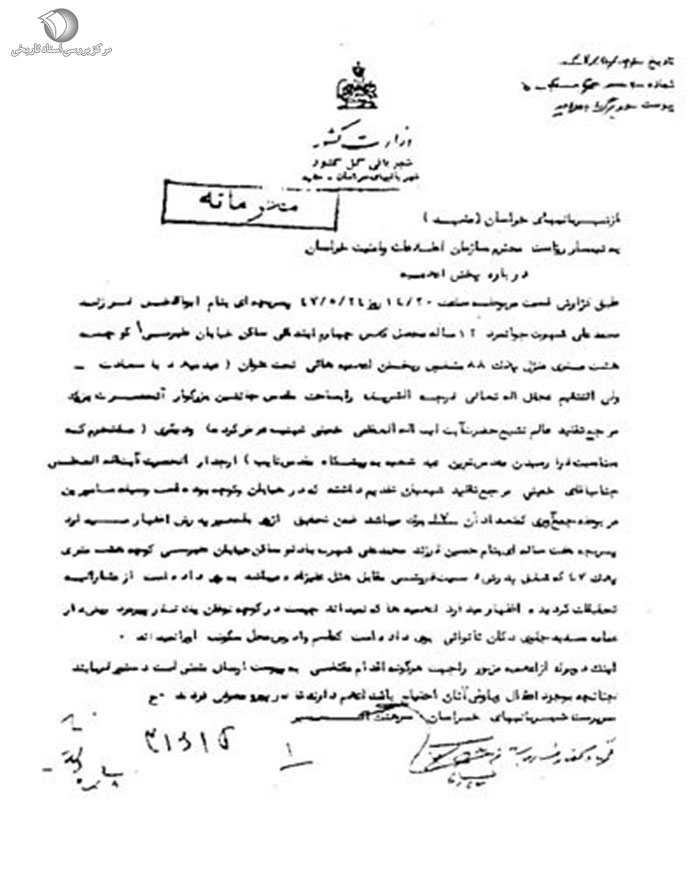 به: تیمسار ریاست محترم سازمان اطلاعات و امنیت خراسان