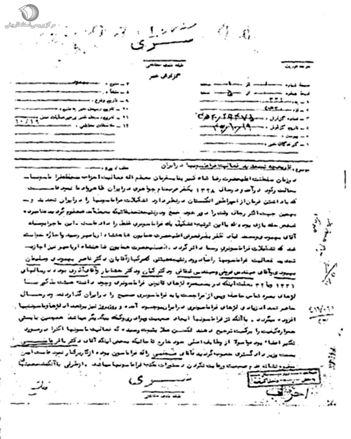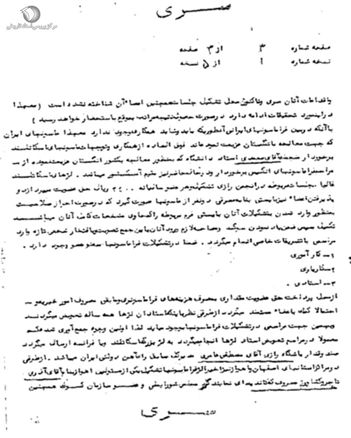 با آنکه در بین فراماسونهاى ایرانى آن طورى که باید و شاید همکارى وجود ندارد معهذا ماسونهاى ایران که جهت معالجه به انگلستان عزیمت نمودهاند فوقالعاده از همکارى و توجهات ماسونهاى اسکاتلند برخوردار [شدهاند] منجمله آقاى محمدى استاد دانشگاه که به منظور معالجه به کشور انگلستان عزیمت نموده از مراحم فراماسونهاى انگلیس برخوردار و در حال حاضر نیز مقیم آن کشور مىباشد.