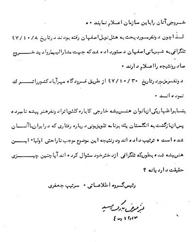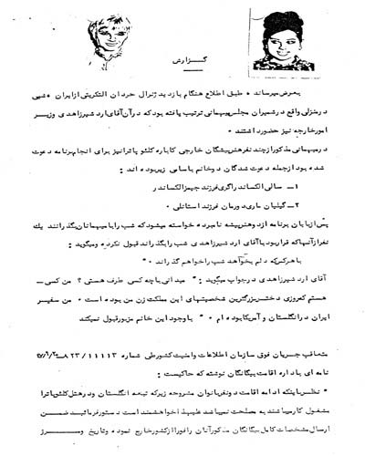 «نظر به اینکه ادامه اقامت دو نفر بانوان مشروحه زیر که تبعه انگلستان و در هتل کلئوپاترا مشغول کار مىباشند به مصلحت نمىباشد، علیهذا خواهشمند است دستور فرمایید ضمن ارسال مشخصات کامل بیگانگان مذکور آنان را فوراً از کشور خارج نموده و تاریخ و مرز خروجى آنان را به این سازمان اعلام نمایند.»