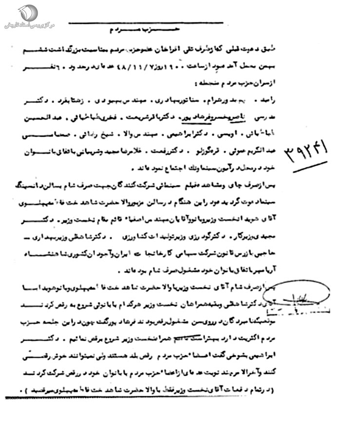 طبق دعوت قبلى که از طرف تقى افراخان عضو حزب مردم به مناسبت بزرگداشت ششم بهمن به عمل آمده بود از ساعت 1900 روز ۴۸ /11/۷ عدهاى در حدود 60 نفر از سران حزب مردم منجمله: