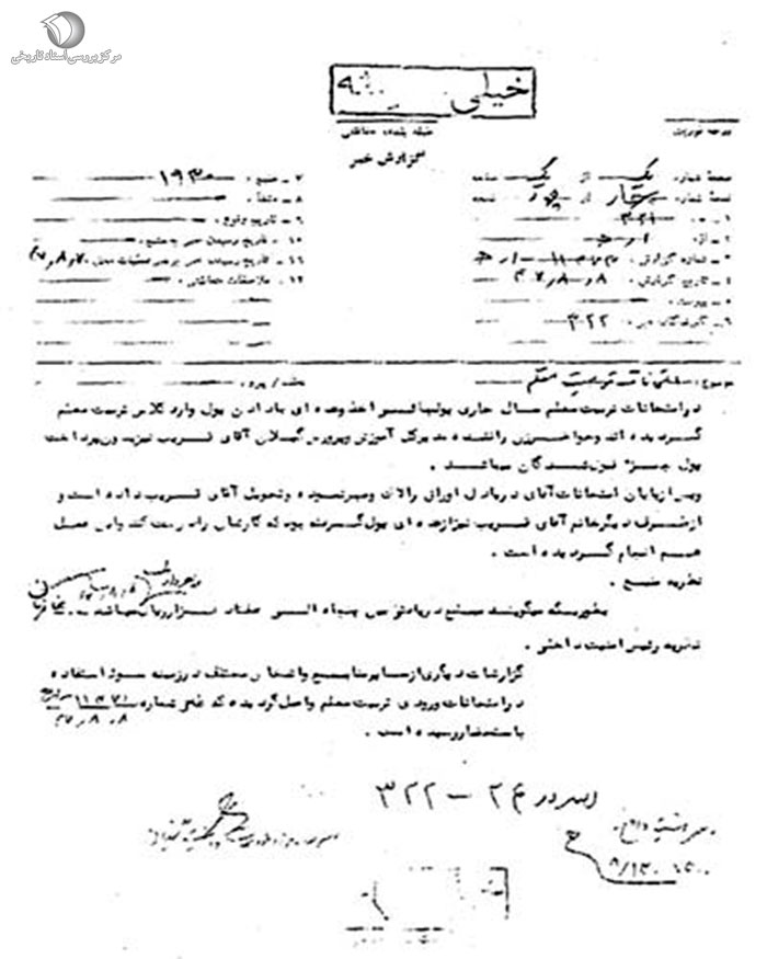 نظریه رئیس امنیت داخلى: گزارشات دیگرى از سایر منابع و اشخاص مختلف در زمینه سوءاستفاده در امتحانات ورودى تربیت معلم واصل گردیده که طى شماره 11371 ـ 1/ه ـ ۴۷ /8/۸ به استحضار رسیده است.