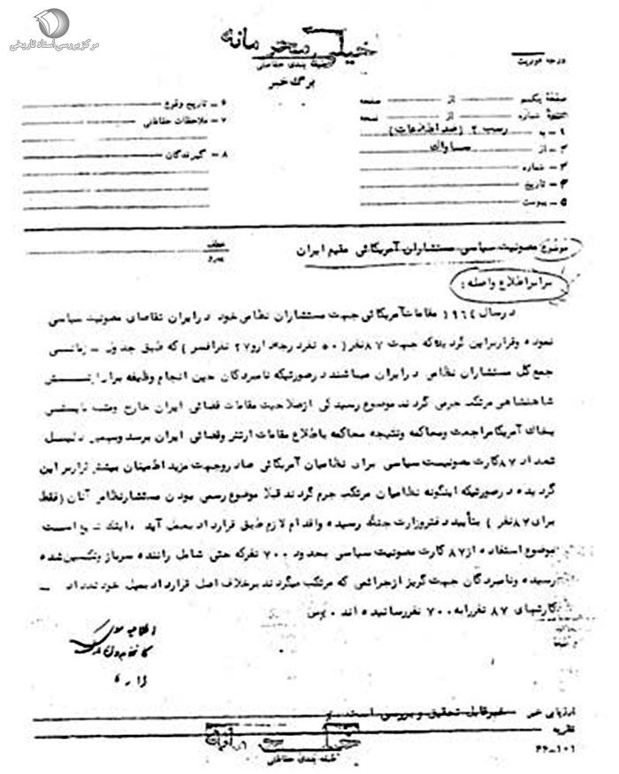 در سال 1964 [1343 ش] مقامات آمریکایی جهت مستشاران نظامى خود در ایران تقاضاى مصونیت سیاسى نموده و قرار بر این گردیده که جهت 87 نفر (50 نفر درجهدار و 27 نفر افسر) که طبق جدول زمانى جمع کل مستشاران نظامى در ایران مىباشند در صورتى که نامبردگان حین انجام وظیفه براى ارتش شاهنشاهى مرتکب جرمى گردند موضوع رسیدگى از صلاحیت مقامات قضائى ایران خارج و متهم بایستى به خاک آمریکا مراجعت و محاکمه و نتیجه محاکمه به اطلاع مقامات ارتش و قضائى ایران برسد و به همین دلیل تعداد 87 کارت مصونیت سیاسى براى نظامیان آمریکایی صادر و جهت مزید اطمینان بیشتر قرار بر این گردیده در صورتى که اینگونه نظامیان مرتکب جرم گردند قبلاً موضوع رسمى بودن مستشار نظامى آنان (فقط براى 87 نفر) به تأیید دفتر وزارت جنگ رسیده و اقدام لازم طبق قرارداد به عمل آید، اینک شایع است موضوع استفاده از 87 کارت مصونیت سیاسى به حدود 700 نفر که حتى شامل راننده سرباز و تکنسین شده رسیده و نامبردگان جهت گریز از جرائمى که مرتکب مىگردند، برخلاف اصل قرارداد به میل خود تعداد کارتهاى 87 نفر را به 700 نفر رسانیدهاند.