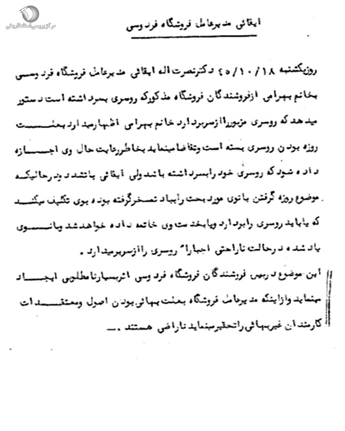 روز یکشنبه ۴۵ /10/۱۸ دکتر نصرتاللّه ایقائى مدیر عامل فروشگاه فردوسى به خانم بهرامى از فروشندگان فروشگاه مذکور که روسرى به سر داشته است، دستور مىدهد که روسرى را از سر بردارد. خانم بهرامى اظهار مىدارد: به علت روزه بودن روسرى بسته است و تقاضا مىنماید به خاطر رعایت حال وى اجازه داده شود که روسرى خود را به سر داشته باشد؛ ولى ایقائى با تشدد و در حالى که موضوع روزه گرفتن بانوى مورد بحث را به باد تمسخر گرفته بوده به وى تکلیف مىکند که یا باید روسرى را بردارد و یا به خدمت وى خاتمه داده خواهد شد و بانوى یادشده در حالت ناراحتى اجباراً روسرى را از سر برمىدارد. این موضوع در بین فروشندگان فروشگاه فردوسى اثر بسیار نامطلوبى ایجاد مىنماید و از اینکه مدیر عامل فروشگاه به علت بهائی بودن اصول و معتقدات کارمندان غیر بهائی را تحقیر مىنماید، ناراضى هستند.