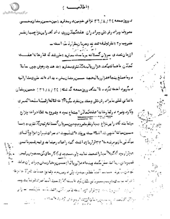 اطلاعیه در روز جمعه ۳۶ /8/۲۴ نزاعى خونین در بخش 15 بین حسین رمضانیخىِ معروف و برادرش تقى و برادرانِ هفتکچلان روى داد که در این نزاع چهار نفر مضروب و 12 نفر توقیف شدند و جریان به قرار ذیل است: از زمان تصدى سروان گلستانه به ریاست بخش 15 مقرر شد که قمارخانه هفتکچلان ماهانه یکصدهزار ریال به کلانترى بخش 15 بدهد و در عوض چون سابقاً در ماه مبلغ پنجاه هزار ریال هم به حسین رمضانیخى مىدادهاند، مقررى مشارٌ الیه دیگر پرداخت نگردد تا اینکه در روز جمعه گذشته (۳۶ /8/۲۴) حسین رمضان[یخی] با تبانى قبلى با برادرش تقى و چندین نفر دیگر با آلات قتاله از قبیل اسلحه کمرى و کارد و غیره در قمارخانه هفتکچلان اجتماع نموده و شروع به تظاهرات و نزاع مىنمایند که در این نزاع چهار نفر مضروب و چون سروان گلستانه رئیس کلانترى 15 با حسین میانه خوبى نداشته است، پروندهاى تنظیم و به دادسراى تهران اعزام و آقاى بیگدلى بازپرس شعبه 27 قرار بازداشت کلیه را صادر مىنماید و رئیس شهربانى، مبلغ یکصدوپنجاه هزار ریال از حسین رمضانیخى و برادران هفتکچلان مىگیرد که تبعید آنها منتفى مىشود ولى در بین مردم شایع مىنماید که والاحضرت اشرف پهلوى به رئیس شهربانى تلفن کرده است که از تبعید آنها صرف نظر نمایند و امروز هم بازپرس شعبه 27 قرار بازداشت نامبردگان را تبدیل به مبلغ یکصدهزار ریال کفیل نموده و حسین رمضان [یخی] از زندان مرخص گردیده است.