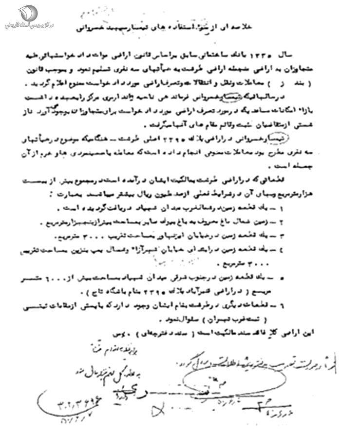 سال 1335 بانک ساختمانى سابق براساس قانون اراضى موات دادخواستهایى علیه متجاوزان به اراضى منجمله اراضى طرشت به هیئتهاى سه نفرى تسلیم نمود و به موجب قانون (بند ز) معاملات و نقل و انتقالات و تصرف اراضى مورد دادخواست ممنوع اعلام گردید. در سالهایى که تیمسار خسروانى فرماندهى ناحیه ژاندارمرى مرکز را به عهده داشت به ازاء امکانات مساعدى که در مورد تصرف اراضى مورد دادخواست براى متجاوزان بوجود مىآورد، ناز شستى از متقاضیان ثبت و قائممقامهاى آنها مىگرفت. تیمسار خسروانى در اراضى پلاک 2395 اصلى طرشت ـ هنگامى که موضوع در هیئتهاى سه نفرى مطرح بود، معاملات ممنوعى انجام داده است که معامله با حسینمردىها و خرم از آن جمله است. قطعاتى که در اراضى طرشت به مالکیت ایشان درآمده است در مجموع بیش از بیست هزار متر مربع و بهاى آن در شرایط فعلى از صد ملیون ریال بیشتر مىباشد به عبارت: