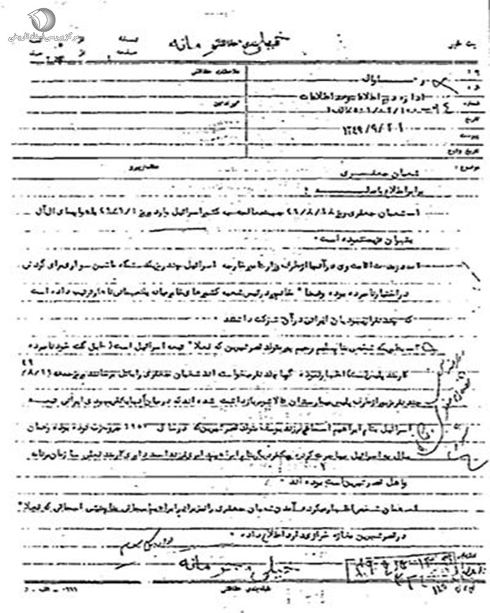 3ـ به طورى که شخصى به نام سلیم رحیمپور متولد قصر شیرین که فعلاً تبعه اسرائیل است (طبق گفته خود نامبرده کارمند پلیس است) اظهار نموده گویا چند نفر مىخواستهاند شعبان جعفرى را به قتل برسانند و روز جمعه ۴۹/۸/۲۹ چند نفر مزبور از طرف پلیس بیمارستان تالاشومر بازداشت شدهاند که در میان آنها یک نفر یهودى ایرانى تبعه اسرائیل به نام ابراهیم اسحاقى فرزند یوسف متولد قصر شیرین که در سال 1950 جزو حزب توده بوده و همان سال به اسرائیل مهاجرت کرده و یک نفر دیگر به نام ابراهیم داورى فرزند احمد داورى کارمند فعلى سازمان برنامه و اهل قصر شیرین است، بودهاند.