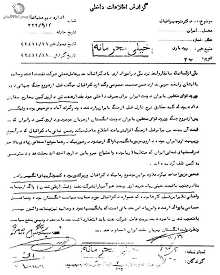 یکی از کسانی که سابقاً روابط نزدیکی در امور اداری با دکتر اقبال، مدیرعامل فعلی شرکت نفت داشته و حالیه با ایشان رابطه خوبی ندارد، ضمن صحبت خصوصی و گله از دکتر اقبال میگفت: قبل از شروع جنگ جهانی دوم و ورود قوای متفقین به ایران، دولت ایران برای مصرف داخلی خود، مقدار هفت تن داروی کنین به خارج سفارش داده بود که کلیه، مطابق نرخ نازل قبل از جنگ به ایران وارد شده و در گمرک آماده ترخیص بوده و لیکن پس از شروع جنگ و ورود قوای متفقین به ایران، دولت انگلستان از جریان موجودی داروی کنین در ایران که قیمت آن به چندین برابر قبل از جنگ افزایش یافته، اطلاع حاصل میکند و ضمن تبانی با دکتر اقبال که در آن موقع وزیر بهداری ایران بوده، داروی مزبور به انگلیسها واگذار میشود. در صورتی که در همان موقع اشخاص زیادی بالاخص در قسمتهای شمالی ایران که مبتلا به مالاریا بوده و احتیاج مبرم به این دارو داشتهاند، به علت عدم دسترسی به کنین تلف گردیدهاند. شخص مزبور اضافه میکرد: علاوه بر این موضوع، زمانی که دکتر اقبال وزیر کشور بوده، کنسولگریهای انگلیس را در بنادر جنوب با قیمت خیلی زیاد خریداری و بعد هم آنها را به شرکت نفت (قبل از ملی شدن) واگذار مینماید و اعمالی نظیر این قبیل کارها بوده که همواره دکتر اقبال مورد حمایت سیاست انگلستان بوده و مشاغل حساسی به او واگذار شده و این پاداش خدماتی است که به انگلیسها نموده و حالیه نیز مینماید و اکنون نیز با منصوب شدن نامبرده به مدیریت عامل شرکت نفت، باید انتظار داشت خدمات مفید و مهمی به نفع سیاست و نظر دولت انگلستان و به زیان ملت ایران انجام دهد.