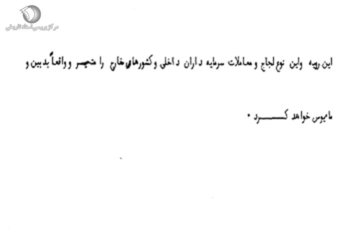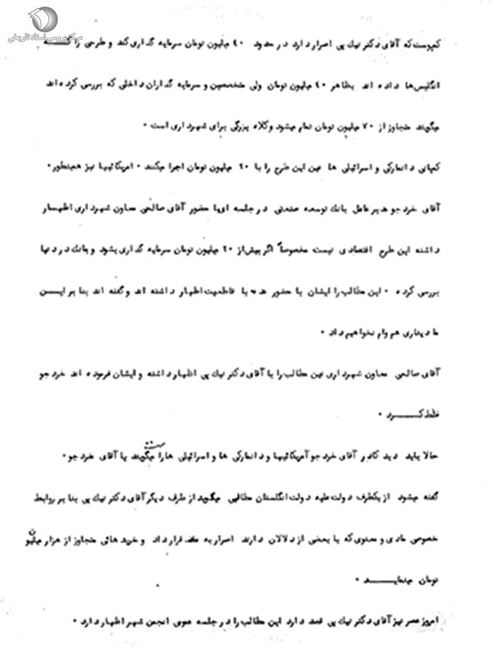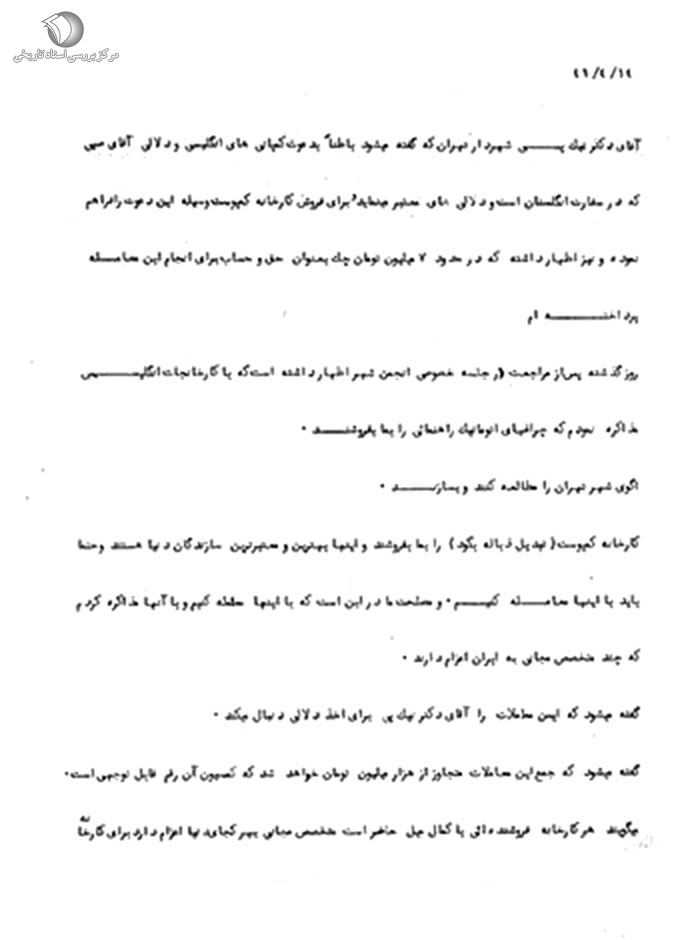 گفته مىشود از یک طرف دولت علیه دولت انگلستان مطالبى مىگوید از طرف دیگر آقاى دکتر نیکپى بنابر روابط خصوصى مادى و معنوى که با بعضى از دلالان دارند اصرار به عقد قرارداد و خریدهائى متجاوز از هزار میلیون تومان مىنماید.