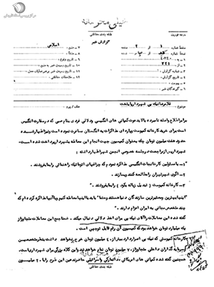 برابر اطلاع واصله نامبرده بالا به دعوت کمپانىهاى انگلیسى و دلالى فردى به نام صبى که در سفارت انگلیس است براى خرید کارخانه کمپوست و پارهاى مذاکرات به انگلستان مسافرت نموده است و نیز اظهار شده حدود هفت میلیون تومان چک به عنوان کمیسیون جهت انجام این معامله به شهردار پرداخت شده است.