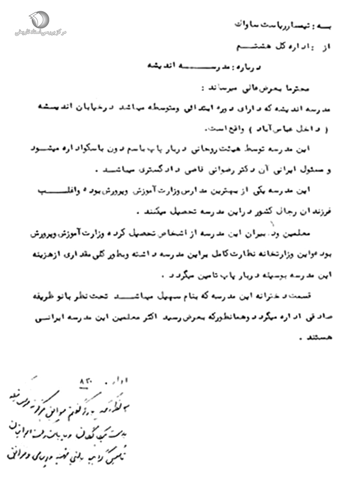 همان طور که بارها گفتم سوابق هرگونه مؤسساتی که به دست بیگانگان و یا با مشارکت ایرانیان تأسیس گردید بایستی تهیه [ناخوانا] و ...