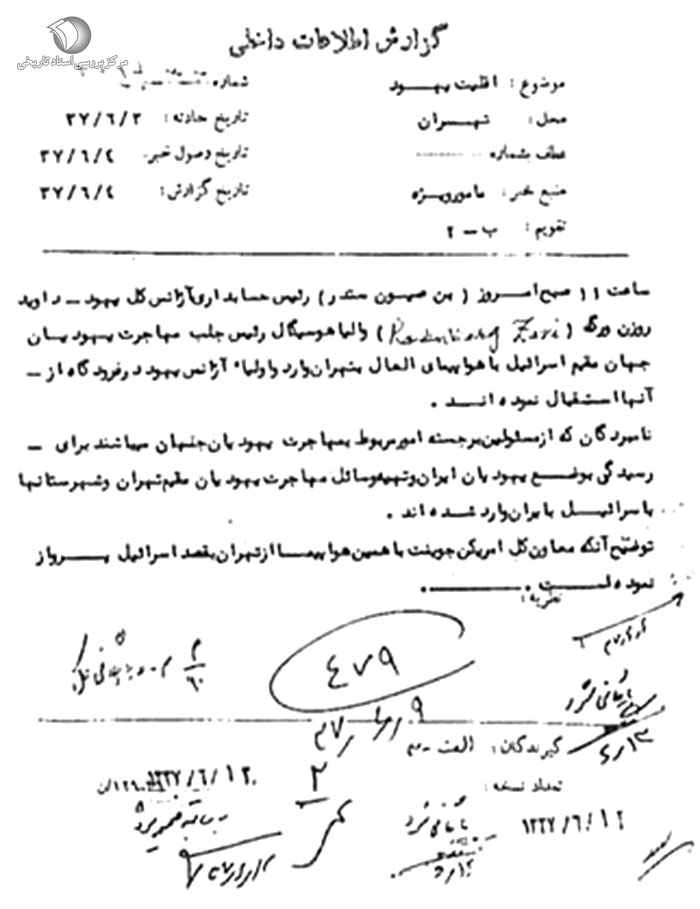 ساعت 11 صبح امروز (بن صیون ستدر) رئیس حسابدارى آژانس کل یهود، داوید روزن ورگ (Rosen Werg Zeui)، والیا هوسیگال رئیس جلب مهاجرت یهودیان جهان مقیم اسرائیل با هواپیماى العال به تهران وارد و اولیاء آژانس یهود در فرودگاه، از آنها استقبال نمودهاند. نامبردگان که از مسئولین برجسته امور مربوط به مهاجرت یهودیان جهان میباشند براى رسیدگى به وضع یهودیان ایران و تهیه وسائل مهاجرت یهودیان مقیم تهران و شهرستانها به اسرائیل، به ایران وارد شدهاند.