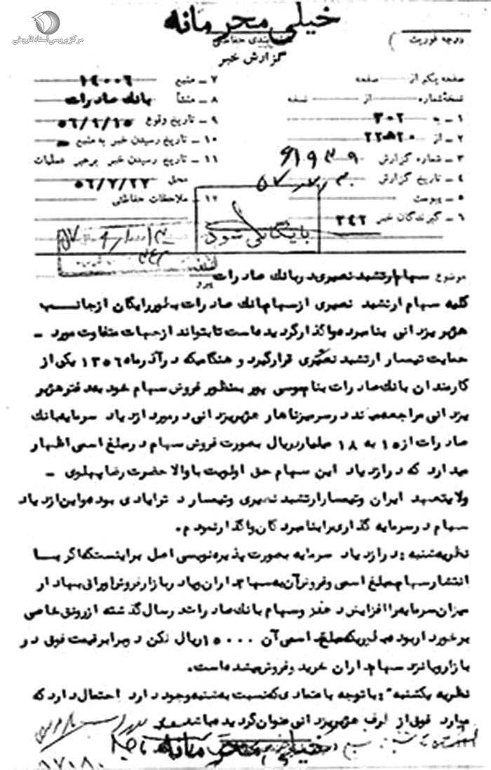 کلیه سهام ارتشبد نصیرى از سهام بانک صادرات به طور رایگان از جانب هژبر یزدانى به نامبرده واگذار گردیده است تا بتواند از جهات متفاوت مورد حمایت تیمسار ارتشبد نصیرى قرار گیرد و هنگامى که در آذر ماه 1356 یکى از کارمندان بانک صادرات به نام موسىپور به منظور فروش سهام خود به دفتر هژبر یزدانى مراجعه مىکند در سر میز ناهار هژبر یزدانى در مورد ازدیاد سرمایه بانک صادرات از 15 به 18 میلیارد ریال به صورت فروش سهام در مبلغ اسمى اظهار مىدارد که در ازدیاد این سهام حق اولویت با والاحضرت رضا پهلوى ولایتعهد ایران و تیمسار ارتشبد نصیرى و تیمسار ایادى بوده و این ازدیاد سهام در سرمایهگذارى را به نامبردگان واگذار نمودم.