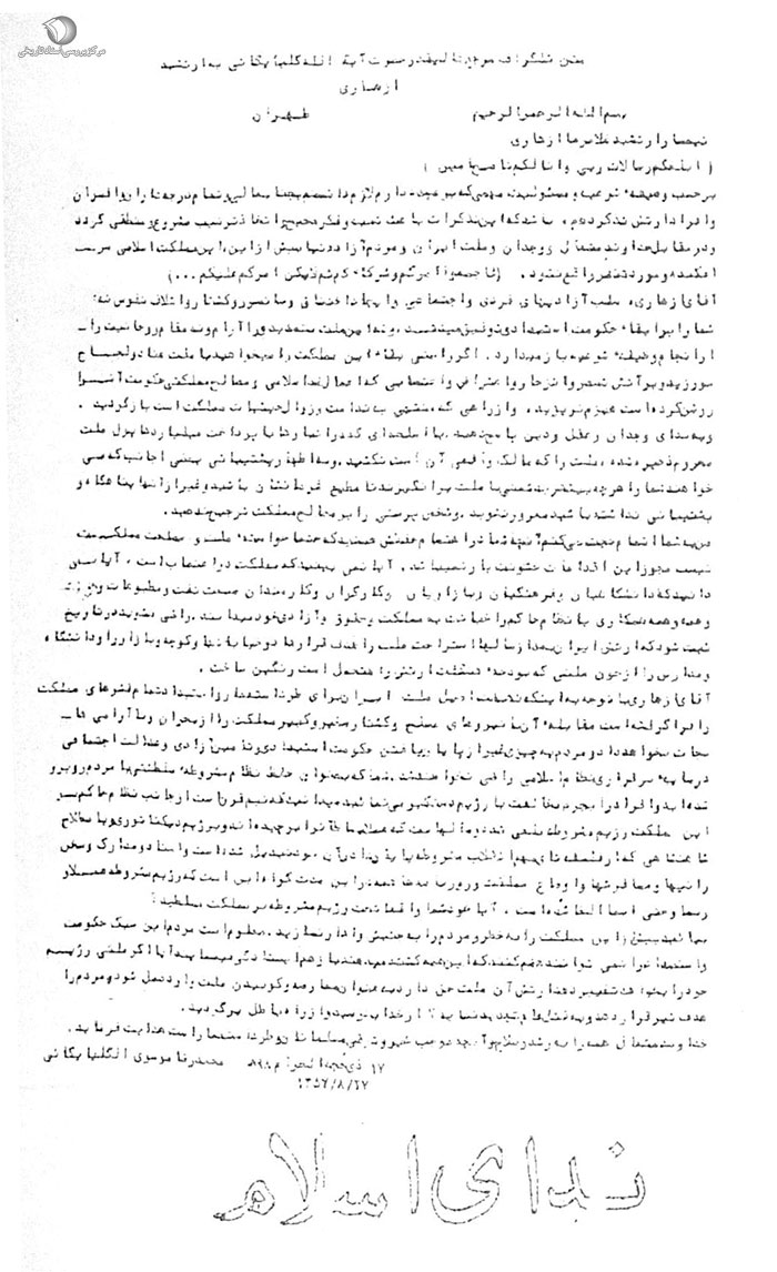 برحسب وظیفه شرعیه و مسئولیت مهمى که بر عهده دارم لازم دانستم به جنابعالى و تمام درجه داران و افسران و افراد ارتش تذکر دهم، باشد که این تذکرات باعث تنبیه و فکر صحیح و اتخاذ ترتیب مشروع و منطقى گردد و در مقابل خداوند متعال و وجدان و ملت ایران و مردم آزاد دنیا بیش از این این مملکت اسلامى سرافکنده و مورد تنفر واقع نشود. (فاجمعوا امرکم و شرکاءکم ثمّ لایکن امرکم علیکم...)
