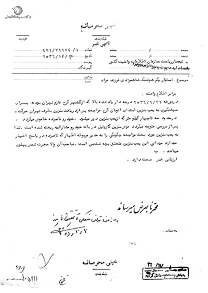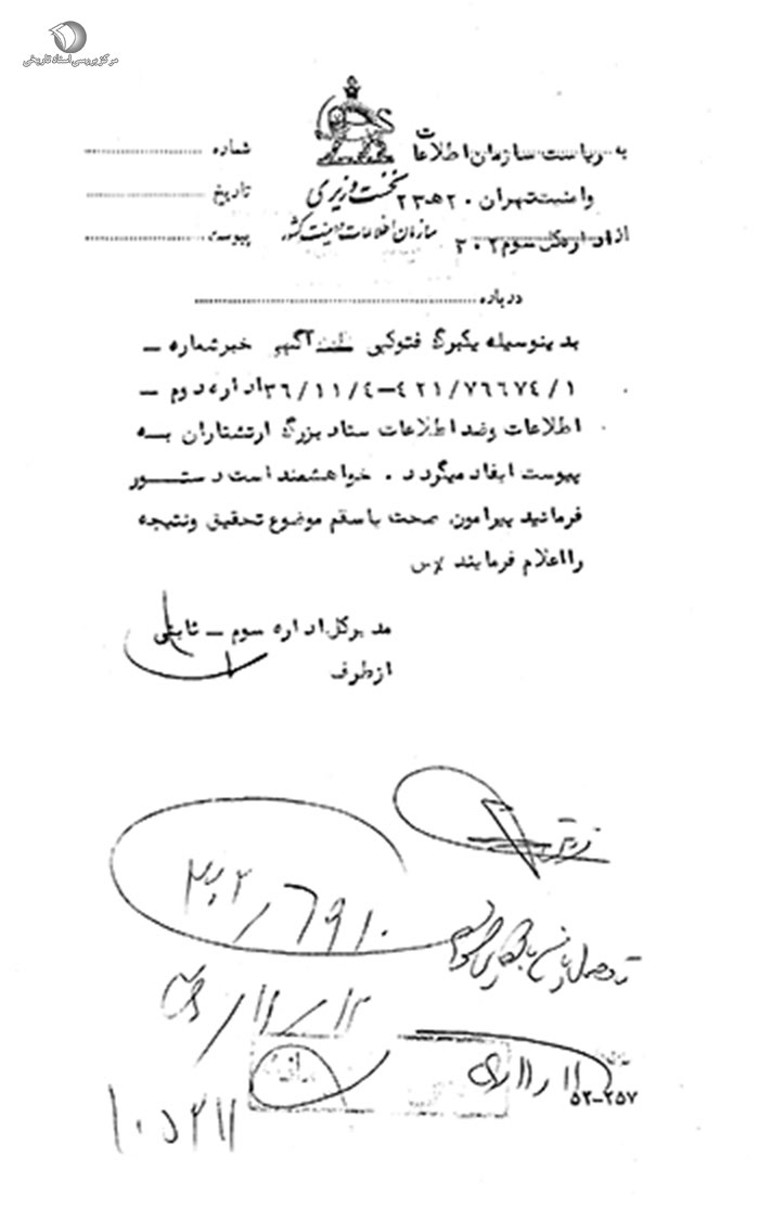 بدینوسیله بک برگ فتوکپى آگهى خبر شماره 421 /76674 /1 ـ 4 /11 /36 اداره دوم اطلاعات و ضد اطلاعات ستاد بزرگ ارتشتاران به پیوست ایفاد مىگردد. خواهشمند است دستور فرمائید پیرامون صحت یا سقم موضوع تحقیق و نتیجه را اعلام فرمایند.