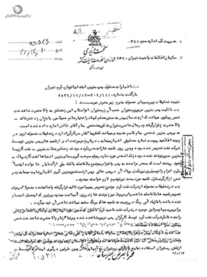 2ـ در تحقیقات معموله از شرکت نفت کرج موضوع تعویض پمپها مورد تائید قرارگرفته و اضافه شده معمولاً در موقع تعویض تلمبهها بلافاصله شاخصهاى مربوط نیز (نوشتهها) در روى آنها ثبت مىشود و بر فرض که این عمل انجام نشده باشد با ماژیک آبى رنگ در روى بدنه تلمبهها که به رنگ سفید مىباشد شاخص آن قید مىگردد. برابر بررسىها و سوابق موجود در شرکت نفت ناحیه کرج تاکنون چندین مورد از بد رفتارى و کتککارى اشخاص و حتى راننده تانکر شرکت نفت کرج توسط کارگران پمپ مزبور مشاهده شده و مرتباً از نام والاحضرت شاهدخت شمس پهلوى سوءاستفاده مىکنند.