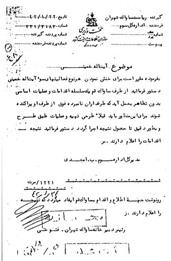 گیرنده : ریاست ساواک تهران فرستنده : اداره کل سوم به فرموده مقرر است براى خنثى نمودن هر نوع فعالیتهاى سوء آیتاله خمینى دستور فرمائید از طرف ساواک قم یک سلسله اقدامات و عملیات اساسى بدون تظاهر به عمل آید که طرفداران نامبرده فوق از طرف او پراکنده شوند. براى این منظور باید قبلاً طرحى تهیه و عملیات طبق طرح و به طور دقیق تا حصول نتیجه اجرا گردد. دستور فرمائید نتیجه اقدامات را اعلام دارند. مدیر کل اداره سوم. امجدى