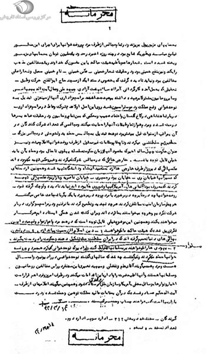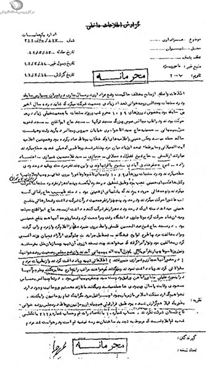 به طوریکه قبلاً هم گزارش شده بود طبق قرار قبلى هیچ یک از روحانیون و وعاظ در مجلس روضهخوانى کاخ گلستان شرکت نکردند. حساب شماره 10 بانک صادرات قم و حساب شماره 3128 بانک ملى شعبه قم اعلام شد که مربوط به تجدید ساختمان مدرسه فیضیه قم است و درخواست شد مردم به حسابهاى مزبور پول بریزند و در تمام مجالس از طرف مردم و روضهخوانها براى اجراى این منظور تبلیغ میشد و به طوریکه شایع بود در چند روزه اخیر در حدود یک ملیون تومان به حسابهاى مزبور ریخته شده است. شعارها عموماً علیه هیئت حاکمه به این مضمون که خداوند ریشه مخالفین مذهب را بکند و نیز به نفع خمینى بود و در حقیقت شعار خمینى ـ عکس خمینى ـ نام خمینى سمبل و شعار اصلى مخالفین بود و نباید نادیده گرفت که به خصوص دستهایکه از مسجد حاج ابوالفتح حرکت و طبق تحقیقى که به عمل آمده کارگردانى آن را اعضاء نهضت آزادى، جبهه ملى و عمِّال آیتالله بهبهانى و سایر روحانیون مشترکاً بر عهده داشته مراسم عزادارى آنها از سینهزنى تبدیل به نوحهخوانى وضع مملکت و دموستراسیون شد روى این اصل اولاً عدم شرکت وعاظ در مراسم عزادارى دربار شاهنشاهى در کاخ گلستان و اعتماد عجیب و محکمى که بین تمام روحانیون و در حقیقت عمامه به سرها درست شده و مردم هم از تمام طبقات آنها را حمایت میکنند و مجالسى که تعداد شرکتکنندگان در آن به مراتب از سنوات قبل بیشتر بوده و همه تبدیل به مجالس حمله به دولت و حتى در مجالس بزرگ حمله به رژیم سلطنتى میکردند و نام، مقام و مقامات غیرمسئول از طرف روضهخوانها اعلام میشد و نیز عنوان حکومت چهل ساله اخیر که مقصود آنها از زمان حکومت سلسله پهلوى تا حال بود و حمله به آن باید خیلى قابل توجه باشد. خارجیهائى که در مجالس شرکت میکردند و خبر و عکس تهیه مینمودهاند عکسهایى که دیروز از طرف خارجیها از دسته میدان شاه و دانشگاه تهیه شد و همچنین از دستهاى که مسیر آنها خیابان رى ـ خیابان بوذرجمهرى ـ خیابان ناصریه و بازار بود عکسهائى تهیه کردند که معروف بود آلمانیها ـ آمریکائیها و شورویها بودهاند، نباید نادیده و کوچک گرفته شود. روضهخوانها چه در منابر چه در برخورد با مردم و چه در برخورد با یکدیگر با شجاعت خاصى میگفتند هر چه از سازمان امنیت به ما تلفن کردند، هر چه تهدید و تطمیع کردند ما نرفتیم و در مراسم سوگوارى دربار شرکت نکردیم و هر چه میخواستند به ما کردهاند و براى کشتهشدن همگى ایستادهایم، هر کار میخواهند، بکنند و همچنین این موضوع خیلى قابل توجه است که در همه مردم اعم از عوام و فهمیده این فکر تزریق شده که هیئت حاکمه ما میخواهند 1ـ دین اسلام را از رسمیت بیاندازد. 2ـ در لندن بهائیهاى دنیا تصمیم گرفتهاند که در ایران سلطنت حقه تشکیل دهند و حکومت را در دست بگیرند. 3ـ یهودیها را میخواهند بر مسلمانها مسلط کنند؛ و به رادیو که نوحهخوانى میکرد همه مردم و روضهخوانها حمله میکردند و میگفتند چه شد که سالهاى گذشته نوحهخوانى در رادیو نبود و امسال هست و مردم همه میگویند آقاى علم و تفضلى و سپهبد نصیرى این سه نفر در رأس مخالفین روحانیون و مسلمانها هستند و آنها اعلیحضرت را وادار به این اقدامات میکنند و در ظرف امروز و فردا هم قرار است اخبار و نوارها به وسائل مخفى به آمریکا و سازمان ملل و عراق فرستاده شود و همچنین میگویند اعلامیهاى از طرف آیتالله حکیم صادر شده که در آن به مقامات عالیه مملکت توهین و حمله شده و در دست بازاریها است که میخواهند چاپ و منتشر کنند. 14 / 3 / 42