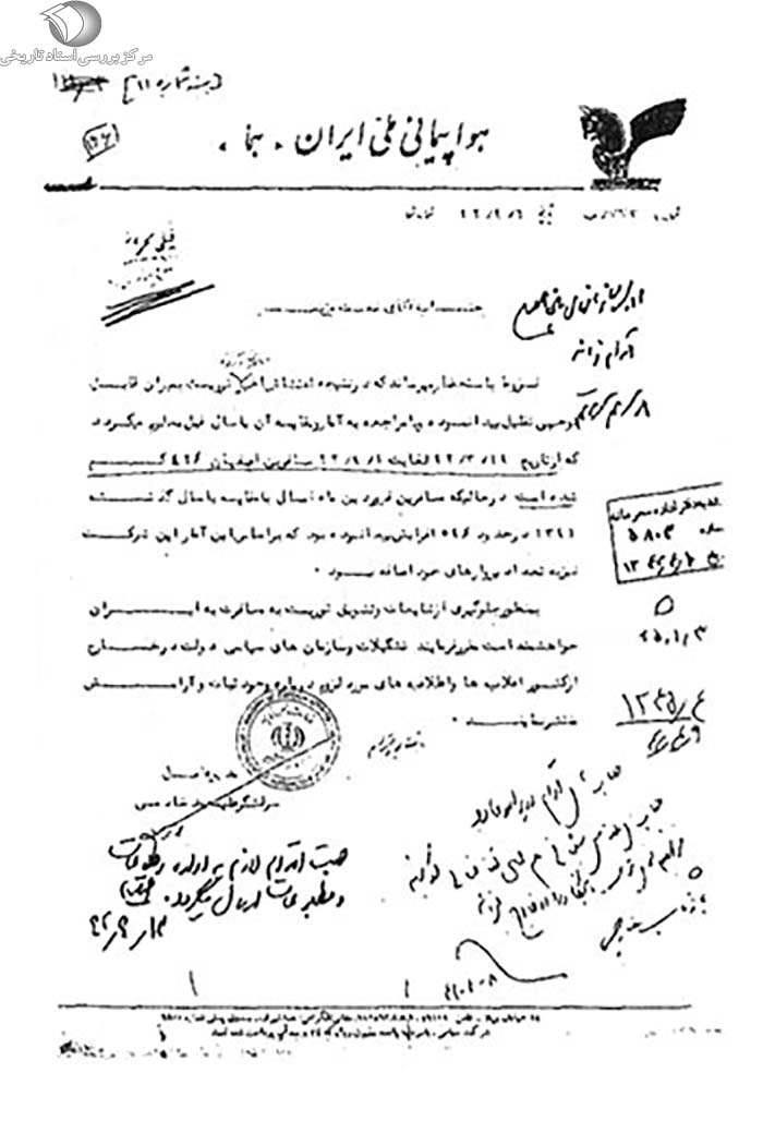 جناب آقاى نخست وزیر لزوماً به استحضار میرساند که در نتیجه اغتشاش اخیر در خصوص آمدن توریست، به میزان قابل توجهى تقلیل پیدا نموده و با مراجعه به آمار و مقایسه آن با سال قبل معلوم میگردد که از تاریخ 14 / 3 / 42 لغایت 1 / 4 / 42 مسافرین اصفهان 42 کم شده است در حالی که مسافرین فروردین ماه امسال با مقایسه با سال گذشته 1341 در حدود 54 افزایش پیدا نموده بود که بر اساس این آمار این شرکت نیز به تعداد پروازهاى خود اضافه نمود. مدیر عامل جناب آقاى آرام وزیر امور خارجه ******