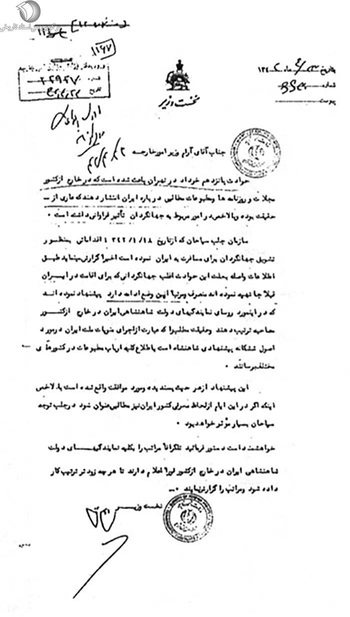 شماره : 6630 تاریخ : 23 / 4 / 42 جناب آقاى آرام وزیر امور خارجه حوادث پانزدهم خرداد در تهران باعث شده است که در خارج از کشور مجلات و روزنامهها و مطبوعات مطالبى در باره ایران انتشار دهند که عارى از حقیقت بوده و بالاخص در امور مربوط به جهانگردان تأثیر فراوانى داشته است. سازمان جلب سیاحان که از تاریخ 18 / 1 / 1342 اقداماتى به منظور تشویق جهانگردان براى مسافرت به ایران نموده است اخیراً گزارش مینماید طبق اطلاعات واصله به علت این حوادث اغلب جهانگردانى که براى اقدامات در ایران قبلاً جا تهیه نمودهاند، منصرف و مرتباً این وضع ادامه دارد. پیشنهاد نمودهاند که در این مورد رؤساى نمایندگیهاى دولت شاهنشاهى ایران در خارج از کشور مصاحبه ترتیب دهند و حقیقت مطلب را که عبارت از اجراى منویات ملت ایران در مورد اصول ششگانه پیشنهادى شاهنشاه است به اطلاع کلیه ارباب مطبوعات در کشورهاى مختلف برسانند. این پیشنهاد از هر حیث پسندیده و مورد موافقت واقع شده است بالاخص این که اگر در این ایام از لحاظ معرفى کشور ایران نیز مطالبى عنوان شود در جلب توجه سیاحان بسیار مؤثر خواهد بود.. خواهشمند است دستور فرمائید تلگرافاً مراتب را به کلیه نمایندگیهاى دولت شاهنشاهى ایران در خارج از کشور فوراً اعلام دارند تا هر چه زودتر ترتیب کار داده شود و مراتب را گزارش نمایند. نخست وزیر |