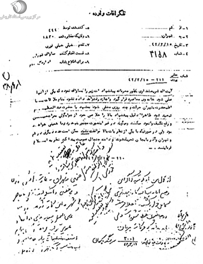 از قول من به او بگویید که اگر این وضع ادامه پیدا کند کار به آبروریزی کامل خواهد کشید. تا حالا حرمت روحانیون حفظ شده است ولى باید بدانید که حرکات پیروان خمینى در تهران، غارت، آتش سوزى و بیعفتى و این که پستترین عناصر شهر در این کار شرکت دارند و عکسالعمل بسیار بدى در افکار عمومی تولید کرده است. این اقدام برای استفاده تبلیغاتی (ناخوانا) بسیار مناسب است. عاقلانه تعقیب نماید و تا حدى که میتواند جلو تحریکات را بگیرد اگر نکند مسئول خودش است. ضمناً باید محرکین را جداً دستگیر و تعقیب کنید.