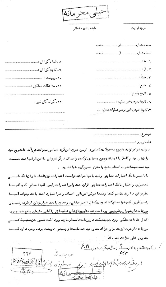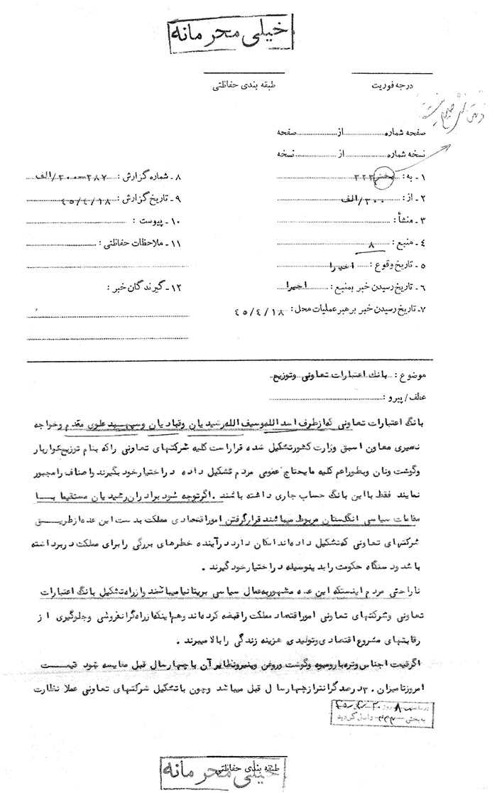 بانک اعتبارات تعاونى که از طرف اسداله و سیفاله رشیدیان و قبادیان و سپهبد علوى مقدم و خواجه نصیرى معاون اسبق وزارت کشور تشکیل شده قرار است کلیه شرکتهاى تعاونى را که به نام توزیع خواربار و گوشت و نان و به طور اعم کلیه مایحتاج عمومى مردم تشکیل داده در اختیار خود بگیرند و اصناف را مجبور نمایند فقط با این بانک حساب جارى داشته باشند. اگر توجه شود برادران رشیدیان مستقیماً با مقامات سیاسى انگلستان مربوط میباشند. قرار گرفتن امور اقتصادى مملکت به دست این عده از طریق شرکتهاى تعاونى که تشکیل دادهاند امکان دارد در آینده خطرهاى بزرگى را براى مملکت در برداشته باشد و دستگاه حکومت را بدینوسیله در اختیار خود گیرند.