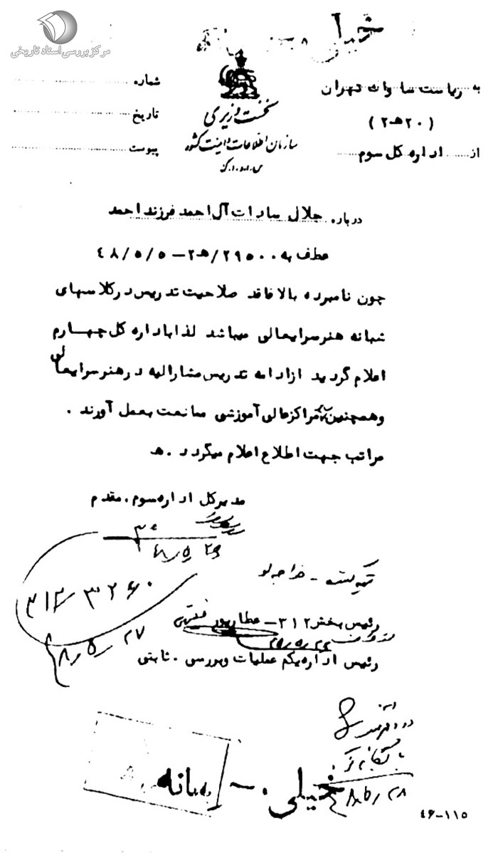 چون نامبرده بالا فاقد صلاحیت تدریس در کلاسهای شبانه هنرسرایعالی میباشد لذا به اداره کل چهارم اعلام گردید از ادامه تدریس مشارالیه در هنرسرایعالی و همچنین سایر مراکز عالی آموزشی ممانعت به عمل آورند. مراتب جهت اطلاع اعلام میگردد.