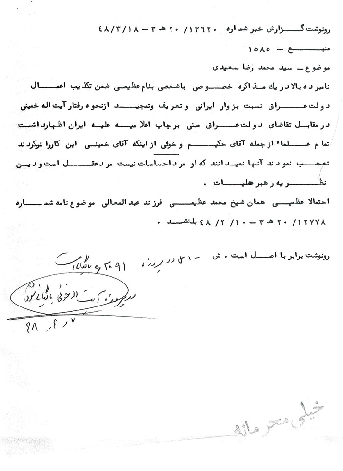 [2] با توجه به اختلافات مرزی عراق با ایران و ادعاهای واهی دولت عراق در این مورد، دولت عراق از هر وسیلهای در جهت منافع خود بهرهبرداری میکرد. یکی از این وسائل قصد سوءاستفاده از روحانیون مخالف رژیم پهلوی ساکن در نجف اشرف و شاخصترین ایشان حضرت امام خمینی(ره) بود. رژیم عراق بارها سعی کرد تا با لطایفالحیل امام را با نقشههای خود همراه سازد و لااقل آن حضرت را به دفاع ضمنی از حکومت عراق و ادعاهایش بکشاند اما هوشیاری و دید وسیع امام خمینی این تلاشها را خنثی و بیاثر نمود. آنچه در سند اشاره شده حکایتی از این مسئله است.
