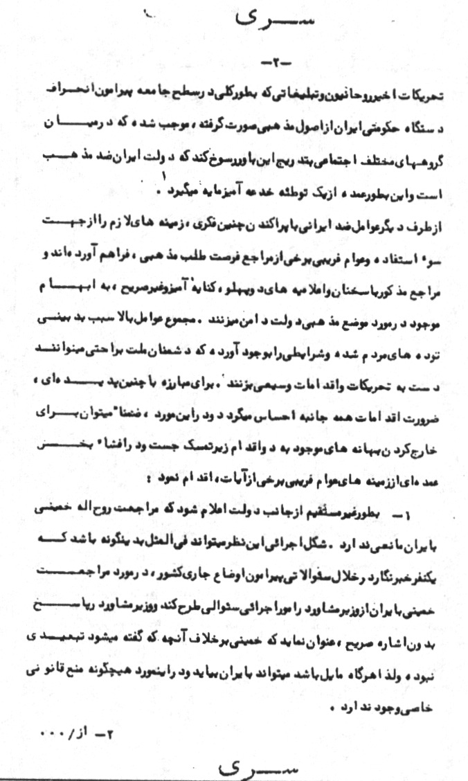 1ـ به طور غیرمستقیم از جانب دولت اعلام شود که مراجعت روحاله خمینى به ایران مانعى ندارد. شکل اجرائى این نظر میتواند فىالمثل بدینگونه باشد که یک نفر خبرنگار در خلال سئوالاتى پیرامون اوضاع جارى کشور، در مورد مراجعت خمینى به ایران از وزیر مشاور در امور اجرائى سئوالى طرح کند و وزیر مشاور در پاسخ بدون اشاره صریح، عنوان نماید که خمینى برخلاف آنچه که گفته میشود تبعیدى نبوده و لذا هرگاه مایل باشد میتواند به ایران بیاید و در این مورد هیچگونه منع قانونى خاصى وجود ندارد.