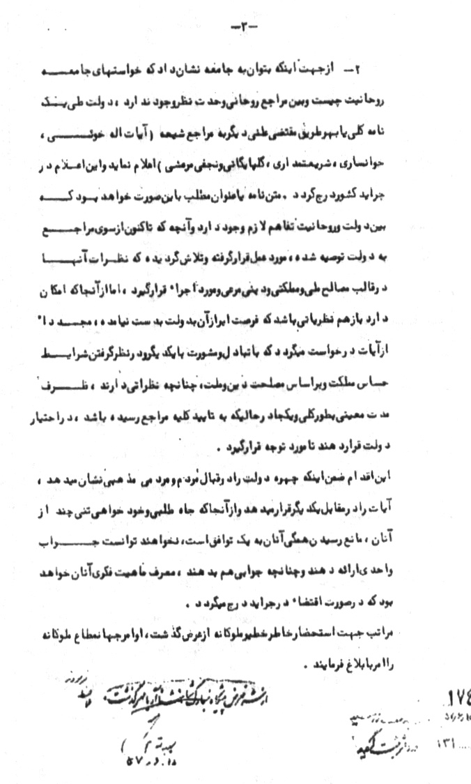 2ـ از جهت این که بتوان به جامعه نشان داد که خواستههاى جامعه روحانیت چیست و بین مراجع روحانى وحدت نظر وجود ندارد، دولت طى یک نامه کلى یا به هر طریق مقتضى علنى دیگر به مراجع شیعه (آیاتاله خوئى، خوانسارى، شریعتمدارى، گلپایگانى و نجفى مرعشى) اعلام نماید و این اعلام در جراید کشور درج گردد. متن نامه یا عنوان مطلب به این صورت خواهد بود که بین دولت و روحانیت تفاهم لازم وجود دارد و آنچه که تاکنون از سوى مراجع به دولت توصیه شده، مورد عمل قرار گرفته و تلاش گردیده که نظرات آنها در قالب مصالح ملى و مملکتى و دینى مرعى و مورد اجراء قرار گیرد، اما از آن جا که امکان دارد باز هم نظریاتى باشد که فرصت ابراز آن به دولت به دست نیامده، مجدداً از آیات درخواست مىگردد که با تبادل و مشورت با یکدیگر و در نظر گرفتن شرایط حساس مملکت و براساس مصلحت دین و ملت، چنانچه نظراتى دارند، ظرف مدت معینى به طورکلى و یکجا در حالی که به تایید کلیه مراجع رسیده باشد، در اختیار دولت قرار دهند تا مورد توجه قرار گیرد.