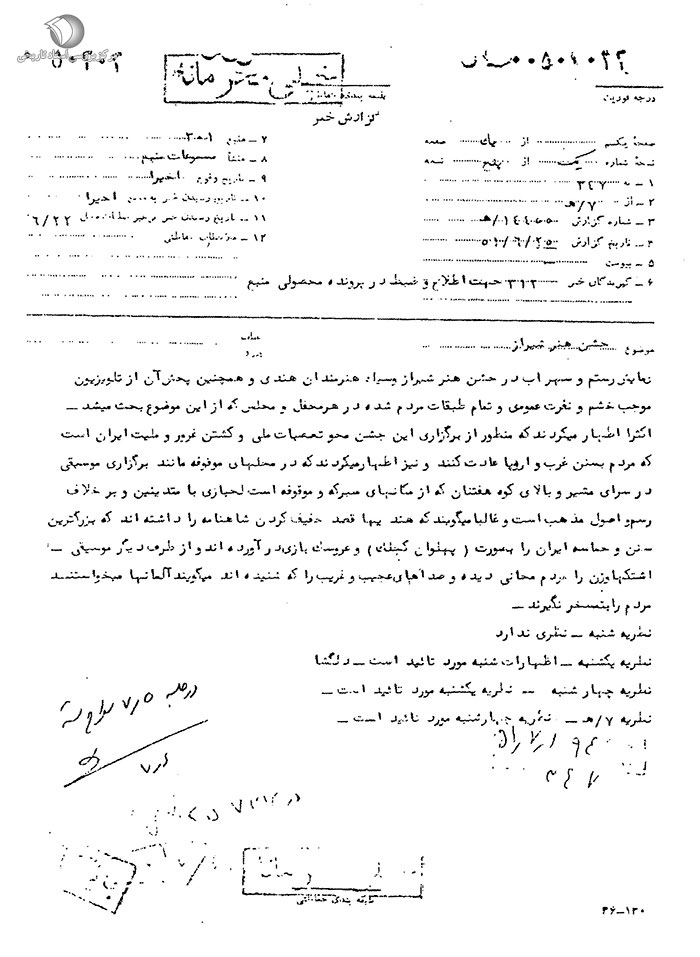 نمایش رستم و سهراب در جشن هنر شیراز وسیله هنرمندان هندی و همچنین پخش آن از تلویزیون موجب خشم و نفرت عمومی و تمام طبقات مردم شده و در هر محفل و مجلس که از این موضوع بحث میشد اکثراً اظهار میکردند که منظور از برگزاری این جشن محو تعصبات ملی و کشتن غرور و ملیت ایران است که مردم به سنن غرب و اروپا عادت کنند و نیز اظهار میکردند که در محلهای موقوفه مانند برگزاری موسیقی در سرای مشیر و بالای کوه هفتخان که از مکانهای متبرکه و موقوفه است لجبازی با متدینین و برخلاف رسم و اصول مذهب است و غالباً میگویند که هندیها قصد خفیف کردن شاهنامه را داشتهاند که بزرگترین سنن و حماسه ایران را به صورت (پهلوان کچلک) و عروسکبازی درآوردهاند و از طرف دیگر موسیقی اشتک هاوزن را مردم مجانی دیده و صداهای عجیب و غریب را که شنیدهاند میگویند آلمانها میخواستند مردم را به تمسخر بگیرند.