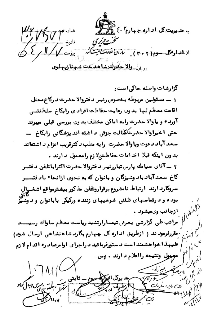 1- مسئولین مربوطه به خصوص رئیس دفتر والاحضرت در کاخ محل اقامت معظم لها بدون رعایت حفاظت افرادی را به کاخ سلطنتی آورده و یا والاحضرت را به اماکن مختلف بدون بررسی قبلی میبرند حتی اخیراً والاحضرت که کسالت جزئی داشتهاند پزشکانی را به کاخ سعدآباد دعوت و یا والاحضرت را به مطب دکتر قریب اعزام داشتهاند بدون اینکه قبلاً اقدامات حفاظتی لازم را معمول دارند.