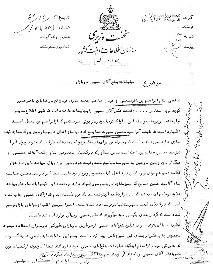 شخصی به نام ابراهیم پورباقر صنعتی (فرد) صاحب جعبهسازی فرد واقع در خیابان ناصرخسرو کوچه مروی سفارش 10000 قطعه عکس آقای خمینی را به چاپخانه عارف داده که طبق اطلاع مدیر چاپخانه در زیر چاپ وسیله این ساواک توقیف و در بازجوئی غیرمستقیم که از ابراهیم فرد به عمل آمد اظهار داشت که کلیشه آن را سید محسن شهرت صنایع که در پاساژ اقبال در چهارسوق بزرگ مغازه کیفسازی دارد به من داده است که به وسیله من برای چاپ عکس مربوطه به چاپخانه عارف داده شود و پول آن را نیز سید محسن صنایع پرداخته است بدین منظور که در کیفهای مخصوص به نام (کیف آیتاله خمینی) میگذارند و دوجین دوجین به شهرستانها میفرستند و قیمت هر جین 15 ریال میباشد و این ده هزار قطعه اخیر هم برای قرار دادن در داخل کیف مخصوص و فروش بوده است. ضمناً برادر سید محسن صنایع به نام آقا سید حسن صنایع که او نیز مغازه در چهارسوق کوچک دارد فروشنده این کیفها به انضمام عکس میباشد. علاوه بر عکسهای نیم تنه که 10 هزار قطعه آن توقیف شده یک فرم عکسهای تمام قد از آقای خمینی چاپ شده است که در لابلای کیفها به شهرستانها نیز فرستاده شده است. اخیراً نیز بین اغلب از جوانان بازار مرسوم شده است که گردنبندی به گردن خود میآویزند که عکس خمینی روی آن قرار داده شده است.