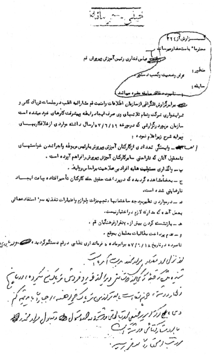 برابر گزارش تلگرافى از سازمان اطلاعات و امنیت قم مشارالیه اغلب در جلسات تریاککشى و شرابخوارى شرکت و تمام تلاشهاى وى صرف ایجاد رابطه و پیشرفت کارهاى خود میشده است. سازمان مزبور در گزارشى که در مورخه 19 / 6 / 57 ارسال داشته مواردى از خلافکاریهاى وی را به شرح زیر اعلام نموده: