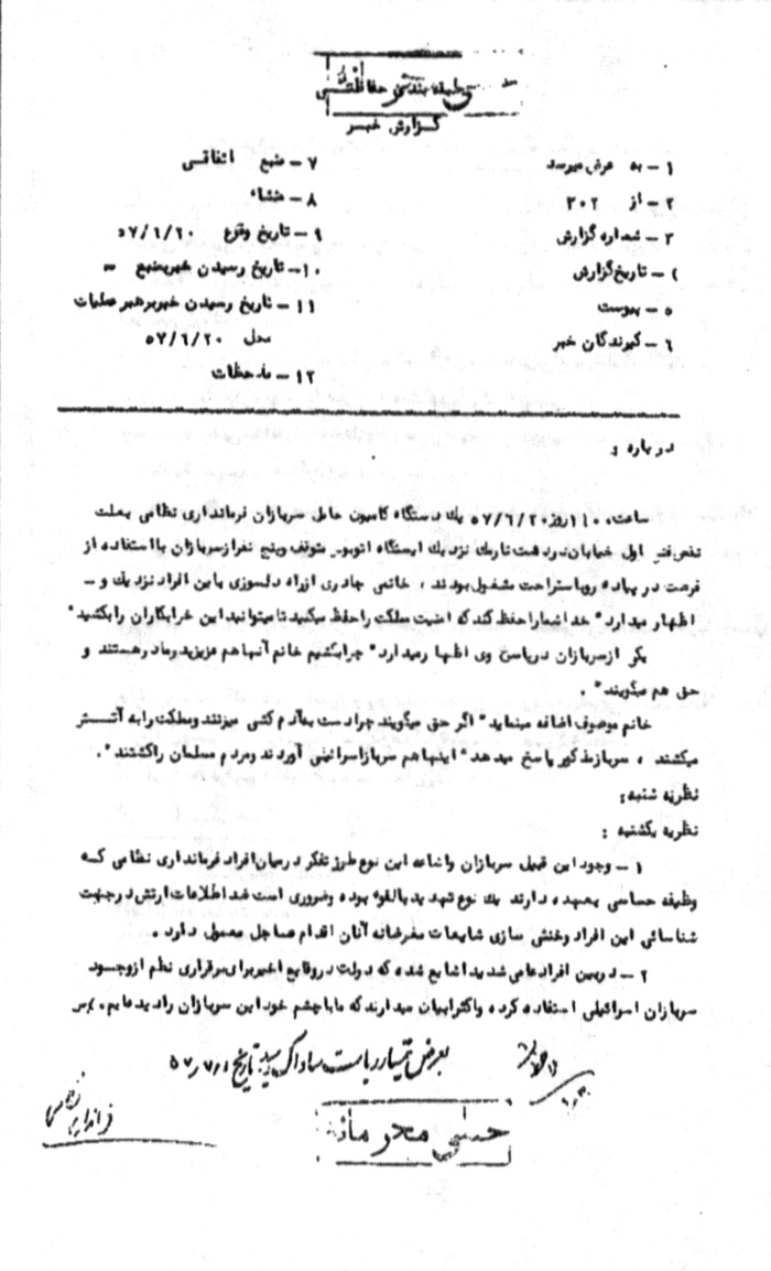 1ـ وجود این قبیل سربازان و اشاعه این نوع طرز تفکر در میان افراد فرماندارى نظامى که وظیفه حساسى به عهده دارند یک نوع تهدید بالقوه بوده و ضرورى است ضد اطلاعات ارتش در جهت شناسائى این افراد و خنثىسازى شایعات مغرضانه آنان اقدام عاجل معمول دارد.