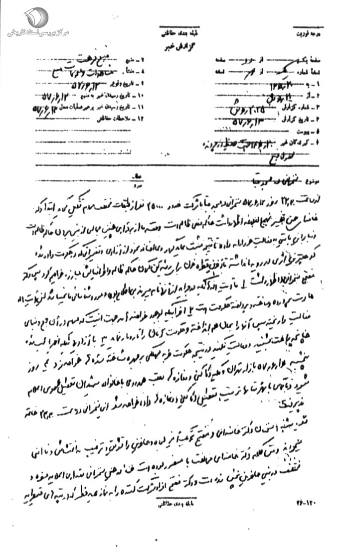 آقاى اخبارى ارشد نگهبان سازمان تهران به دلیل این که گزارش فوق به طور مشروح توسط کارمند اعزامى از سازمان تهران به مسجد قبا گزارش شده از گرفتن این تلفنگرام خوددارى و به همین جهت متن تلفنگرام به سازمان تهران منعکس نشده است.